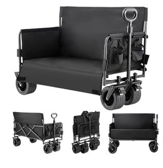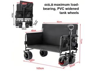 Carro plegable versátil, ideal para playa, montaña o camping. Soporta hasta 445 libras de carga. - Ruedas anchas de PVC tipo tanque. - Dimensiones aproximadas: 105cm (largo) x 55cm (ancho) x 71cm (alto). - Medidas del compartimento principal: 92cm (largo) x 48cm (ancho) x 19cm (profundidad). - Altura total con asa extendida: 73cm. - Diámetro de las ruedas: 10cm. *Esta nuevo, sin salir de la caja y todo bien empaquetado.