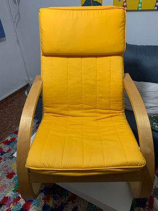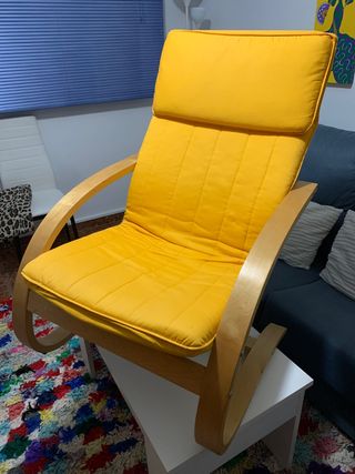 Cómodo sillón tipo hamaca con un diseño balancín. - Estructura de madera curvada. - Cojines acolchados en color amarillo.