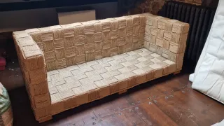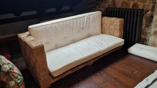Conjunto de cojines para sofás hechos con palets. En total, son tres asientos y tres respaldos. Los asientos miden 120x80x12cm. Los respaldos miden 120x40x12cm. Nunca se han usado. Los paleta cogieron humedad y nunca se utilizaron.