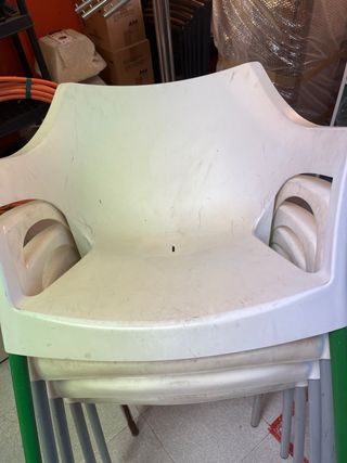 Conjunto de siete sillas de plástico por unidad a 6€y las 7 a 5€ - Diseño apilable para fácil almacenamiento. - Patas estables para mayor seguridad. - Respaldo curvo para mayor comodidad.