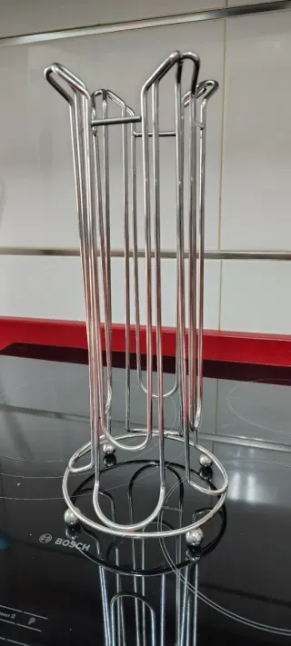 Elegante soporte para cápsulas de café, con un diseño moderno y funcional. - Fabricado en metal. - Color plateado. - Capacidad para varias cápsulas. - Dos cápsulas reutilizables