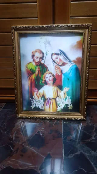 Cuadro lenticular que cambia de imagen dependiendo del ángulo por donde la mires. Una de las imágenes es la virgen María Auxiliadora y la otra imagen es María, José y Jesús. Medidas: De alto 37,9 cm y de ancho 30,6 cm.