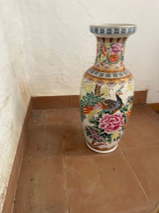 Elegante jarrón decorativo de estilo chino, con un diseño vibrante y detallado. - Motivos de flores y aves exóticas. - Acabado brillante y colorido. - Pieza de cerámica de alta calidad.