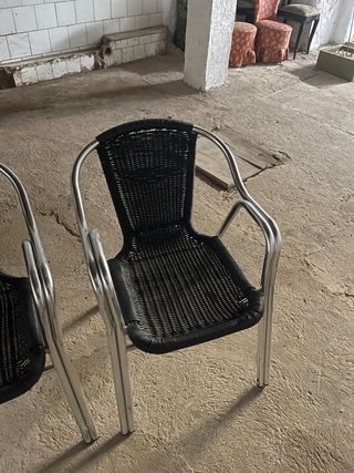 Conjunto de dos sillas de exterior con un diseño moderno y elegante. - Estructura de metal plateado. - Asiento y respaldo de mimbre negro.