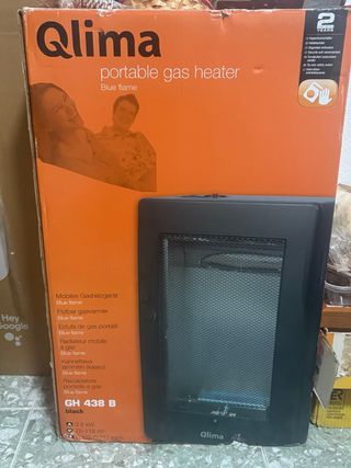 Estufa de gas portátil Qlima modelo GH 438 B en color negro. Diseñada para ofrecer calor de forma eficiente. - Potencia: 3.8 kW. - Cobertura: 76-118 m³. - Consumo: 0.102-0.277 kg/h.