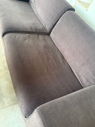 Sofá de tres plazas con un diseño moderno y cómodo. Tapizado en tela. - Estructura robusta. - Cojines mullidos. - Ideal para salón o sala de estar. Falta limpiar un poco.