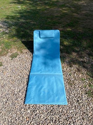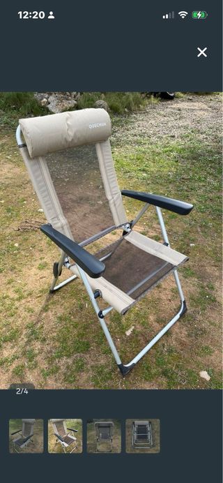 Silla reclinable de la marca Quechua, ligera y fácil de transportar. - Estructura de metal y plástico. - Asiento y respaldo de tela. - Reposacabezas acolchado.