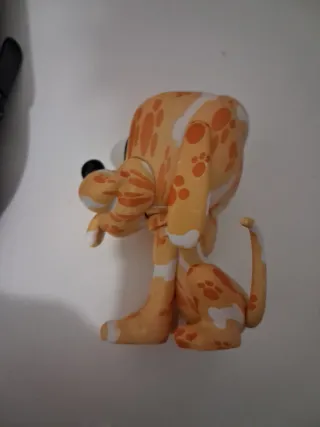 Figura decorativa de un perro con un diseño original y llamativo. - Patrón de manchas y huellas. - Colores naranja y blanco.