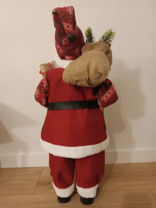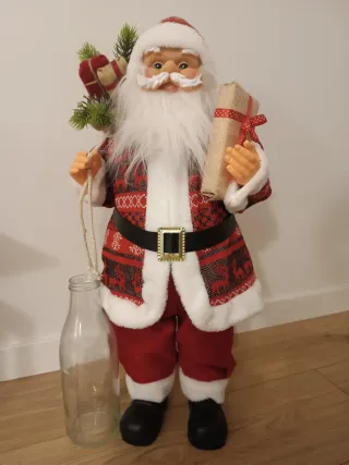 Figura decorativa de Papá Noel, ideal para estas fiestas. Venta presencial o con envío. - Viste un traje rojo con detalles invernales. - Lleva un regalo envuelto en una mano. - Incluye un vasca el en la punta del gorro. - Adorno con ramas de pino y sacos.