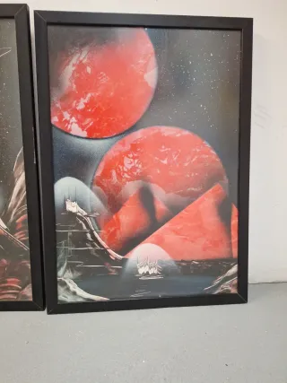 Conjunto de dos cuadros con un diseño abstracto y espacial. - Tonos predominantes en rojo y negro. - Marco negro incluido.