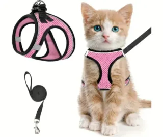 Conjunto de arnés y correa para gatos, ideal para paseos seguros. El arnés es de malla transpirable y ajustable. - Arnés de malla. - Correa incluida. - Cierre de seguridad.
