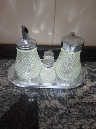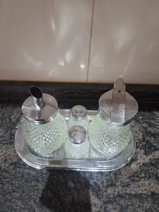 Elegante juego de cristal tallado con detalles metálicos. - Diseño vintage. - Incluye bandeja. - Piezas con acabado plateado y transparente.