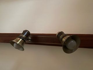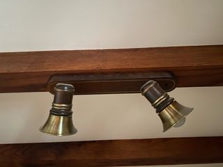 Lámpara de techo con un diseño rústico y elegante. - Base alargada con acabado en madera oscura. - Dos focos orientables con detalles dorados.