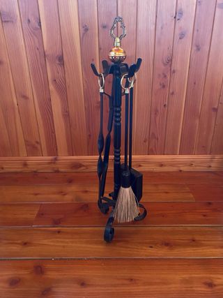 Conjunto de accesorios para chimenea con un diseño elegante. - excelente calidad. - Incluye soporte, pala, cepillo, pinzas y atizador. - Acabado en metal negro con detalles dorados. - Base decorativa con remates curvos.