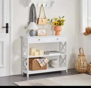 Mueble recibidor con un diseño elegante y funcional. - Acabado en blanco y detalles en marrón. - Combinación de materiales de madera y mimbre.