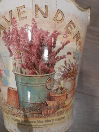 Macetero de metal con un diseño vintage y romántico, ideal para dar un toque especial a tu hogar. - Estampado floral con lavanda. - Borde superior ondulado con detalles dorados.