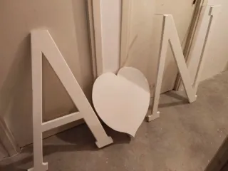 Conjunto de letras decorativas de madera con un corazón. Están en buen estado, solo tienen alguna marca del uso. Es un lote de 3: las letras A y N, y un corazón central. Si se recogen en mano, se regala la base. Medidas aproximadas: - Las letran tienen 100 cm. de alto y 66 cm. de ancho (en la base). - El corazón central mide 60 cm. x 52 cm. Tal y como se ve en las fotos, los 3 elementos tienen manera de ser atornillados a cualquier base. evento, boda, comunión, fiesta, celebración, decoración, jardín