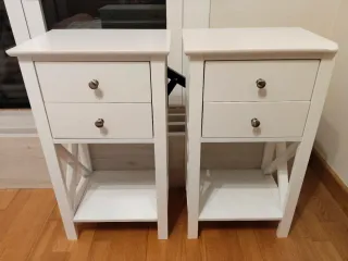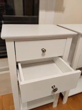 Conjunto de dos mesitas de noche altas. Blancas, de madera. Cada una tiene 2 cajones. Están en muy buen estado. Una de ellas tiene una esquina redondeada, reparada por un golpe (se puede ver en la última foto). Medidas en las fotos (70x40x30cm.). No se envían, se recogen en mano. mesillas de noche, mesitas de noche, habitación, dormitorio