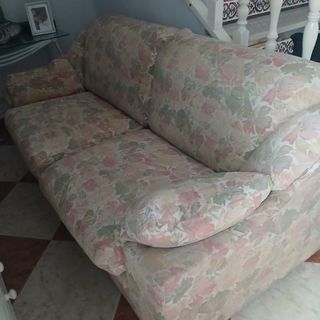 Se vende conjunto de sofá de dos plazas y un sillón individual. - Tapicería floral con tonos verdes y rosas. - Tejido de tela.