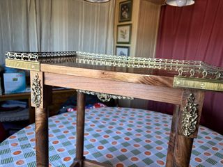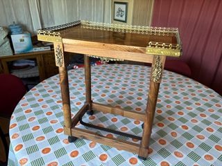 Elegante mesa auxiliar de nogal español con un diseño clásico y refinado. - Tablero macizo (nudo) a espejo, aparecen endiduras por resecamiento, reflejado en fotos claramente. - Barandilla clasica en laton. - Patas de torneadas con detalles ornamentales de laton macizo. - Base con ruedas para facilitar su movilidad.