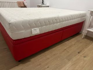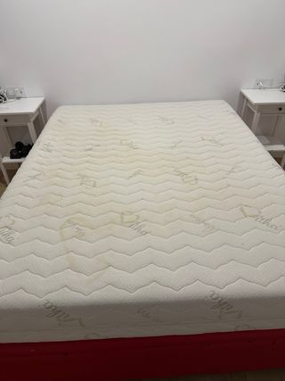 Se vende cama de 150 cm con su colchón y base. - Base de cama en color rojo. - Colchón de tejido blanco. como se pude ver está bastante usada
