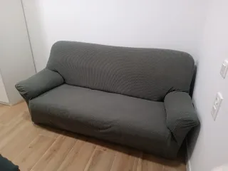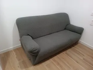 Sofá de tres plazas con una funda gris que le da un aspecto renovado. Es cómodo y se adapta bien a diferentes espacios. - Funda de tela con textura. - Diseño moderno.