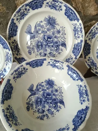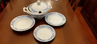 Vajilla antigua de la fábrica Ibero Tanagra de Santander, que consta de: - Vajilla flor azul 7 platos llanos 7 platos hondos 11 platos postre 4 fuentes (2 pequeñas, 1 mediana y 1 grande) 1 sopera 1 ensaladera 1 bol - Patrón ornamental en azul y blanco