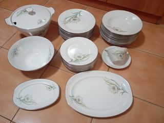 Vajilla familiar de porcelana Santa Clara de Vigo, de diseño floral, de los años 30. Consta de: - 19 platos llanos - 12 platos soperos - 12 platos postre - 1 Sopera - 1 Salsera - 2 Rabaneras - 2 Bandejas de 38x24'5 y 34x22