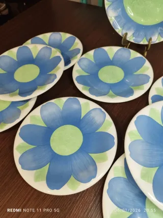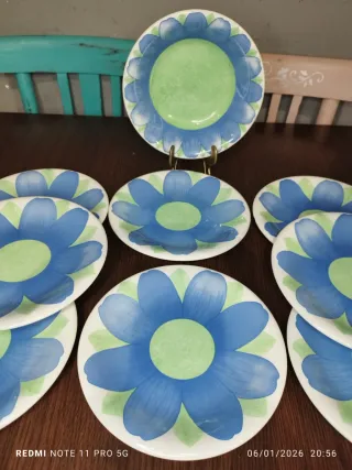 ⚠️NO NEGOCIABLE⚠️ Conjunto de nueve piezas de vajilla con un diseño floral. - Diseño de flores en tonos azules y verdes. -8 platos llanos Diámetro 20 Cm. -1 Ensaladera Diametro 21 Cm. (3 PLATOS CON UNA MUESCA POR DETRAS MIRAR ULTIMAS FOTOS) ★★ SE HACEN ENVIOS POR WALLAPOP★★ GRACIAS. MUEBLES MESAS SILLAS SILLONES SOFAS DECORACION VAJILLA PORCELANA FRANCESA LIMOGES SARREGUEMINES BAVARIA LA CARTUJA DE SEVILLA COPAS VASOS CRISTAL CHINO CERAMICA CHINA JAPONES TENEDORES CUCHILLOS CUCHARAS COLECCION ANTIGUA ANTIGUO RETRO VINTAGE HOME RUSTICO LAMPARA