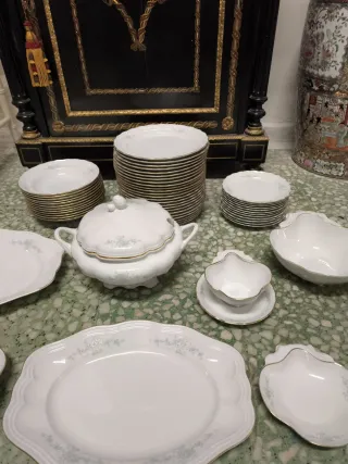 Conjunto de vajilla de porcelana con un diseño clásico y elegante. - Piezas con delicados motivos florales en tonos azules. - Borde dorado - Ideal para coleccionistas o para quienes buscan un estilo vintage. 23 plantos llanos, 12 platos medios, salera con plato, 2 fuentes ovaladas grandes, una mediana, dos pequeñas y una sopera