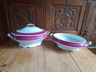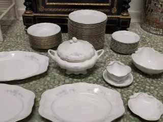 Elegante vajilla antigua de porcelana con un delicado borde azul y dorado. Incluye varias piezas: 6 platos planos 6 platos hondos 6 terrinas de sopa con platillos 1 bol para verduras/carnes con tapa 1 bol para patatas 1 terrina para salsas 6 tazas de café con platillos 6 platos para tarta/desayuno 1 cafetera 1 taza para azúcar con tapa 1 taza para leche con tapa 6 hueveras Algo para ocasiones especiales!