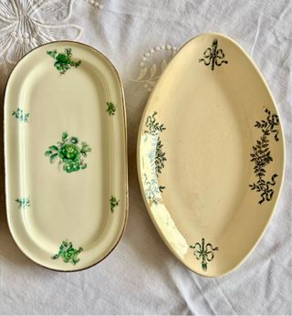 Conjunto de dos platos antiguos con un diseño floral verde. - Plato ovalado con borde dorado. - Plato alargado con decoración de lazos y ramas. #cristal #platofrances #terredefer #luneville #gien #sarreguemines #digoin #longchamp #longwy #limoges #porcelana #frenchvintage #antiqueplatos #frenchantiques #vajillafrancesa #genevievelethu #barbotine #barbotina #villeroy&boch #langenthal #gien #digoin #bohemia #moulindesloups #bavaria #longchampcecile #platoslongchamp #cuencos #bandeja #keramik #badonviller #platitos #limoges #fuentes #salins #zarahome #maisondumonde #kavehome #majolica #loza #faience
