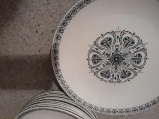 Conjunto de vajilla antigua con un diseño floral en blanco y negro. - Piezas de cerámica y porcelana. - Diseño redondo y ovalado. - Incluye: 12 platos hondos 20 platos llanos 12 platos postre 3 fuentes ovaladas grandes (3 tamaños) 2 fue tes ovaladas pequeñas 1 sopera con tapa 1 ensaladera 1 salsera