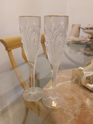 Conjunto de seis copas antiguas de champán con un elegante borde dorado. - Diseño clásico y refinado. - Cristal tallado con detalles. - Base estable.