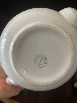 Tetera de cerámica blanca con un diseño clásico, perfecta para añadir un toque vintage a tu hogar. - Estilo: Decoración vintage. Tazas de Porcelana Silesia (K.St.T.) El sello con la corona y las letras K.St.T. pertenece a la fábrica de K. Steinmann en Tiefenfurt, Silesia (antigua Alemania, hoy parte de Polonia). • Antigüedad: aprox de entre 1915 y 1928.Juego de Café Cerámica Melada (Años 70) Este conjunto es un clásico de la década de los 70.Se caracteriza por su acabado brillante en tono miel o caramelo. Vajilla Pickman - La Cartuja de SevillaEsta es tu pieza de mayor valor histórico y comercial. El sello del ancla Escucho ofertas