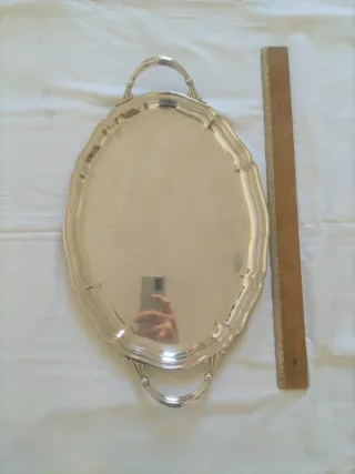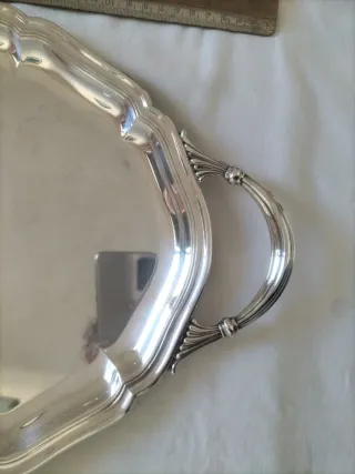 Plata Alpaca Alpadur vajilla antigua bandeja art deco fuente de servir Es una bandeja grande, 55cm entre asas por 33cm de ancho de estilo Art Decó de la marca Alpadur (alpaca Pedro Durán) sellado con peso y buena hechura. Tiene algunas marcas, manchitas y arañazos del uso, lo normal en este tipo de piezas, pero es muy elegante. Tengo otras fuentes bandejas y objetos para mesas especiales en mi perfil, ver, gracias.