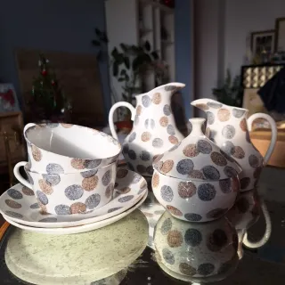 Conjunto de porcelana de la marca castro años 50, antiguo sagadelos, sello dolmen, con un diseño de lunares. - Incluye dos tazas con sus platos de desayuno. - 2 Jarras. - Azucarero con tapa. - Diseño de lunares en tonos azul, marrón y gris.