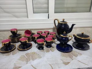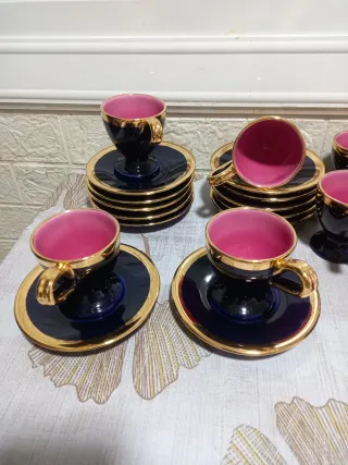 Hago envíos Antiguo Conjunto de vajilla de la prestigiosa casa Vallauris, modelo Mónica, de los años 60. El diseño presenta un acabado exterior en azul cobalto y un interior en lava rosa con asas y bordados en color oro Están en buen estado de conservación son bastante antiguas esta completa no tienen grietas ni faltan trozos . - Tetera/cafetera grande - lechera - Azucarero - 12 tazas - 12 platillos