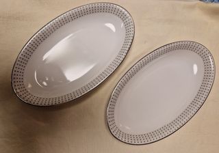 Dos antiguas bandejitas de porcelana de Bohemia, impecables, ved fotografías. Ideales para decorar tu mesa en las ocasiones más importantes. Fabricadas en la antigua Checoslovaquia son de antes de la separación del país en dos repúblicas, es decir, anteriores a 1989. Medidas del óvalo 22x12 cm. Bordes plateados perfectos. En los ítems que tengan precios menores a 15€ no se aceptará ninguna rebaja. Gracias!