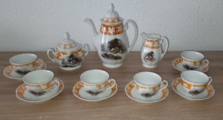 Precioso juego de café antiguo, con un diseño encantador. Ideal para amantes de lo vintage. Entregar por walapoop o en mano - Incluye tetera, azucarero, lechera y 6 juegos de taza y plato. - Piezas en porcelana con detalles en naranja y blanco. - Diseño floral con escenas campestres. Una tácita se ve en la foto tiene una picadura pequeña