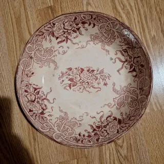 Preciosa fuente o ensaladera antigua, datada en el siglo XIX. Su diseño floral en tonos rojos sobre fondo beige le confiere un encanto vintage. - Diseño floral detallado. - Borde decorado con motivos ornamentales.