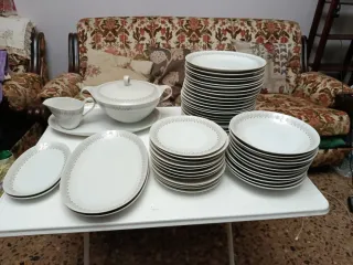Antigua vajilla Bidasoa oro, de estilo francés. Con sopera, tres fuentes grandes, dos pequeñas, salsera, ensaladera, 22 platos llanos, 12 pequeños y 11 soperos. Si hay que hacer envio hay que sumar 25€ por la proteccion y el embalaje.