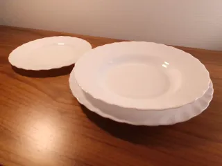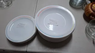Platos blancos básicos. Delgados, no pesan ni ocupan mucho. No sé si son Arcopal, Duralex, Luminarc... pero del estilo. Algunos pone Harmonia y otros Arc. También para hostelería. 6 llanos 11 hondos 2 postre 2 fuentes pequeñas También tengo cubiertos y menaje si te interesa pregúntame y hago precio.