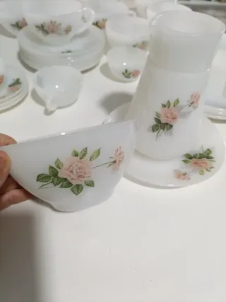 Conjunto de vajilla vintage Arcopal con un delicado diseño floral. - Fabricada en vidrio opalino. - Decoración de rosas en tonos rosados y verdes. - Piezas elegantes para cualquier ocasión. 10 tazas grandes, 3 pequeñas, 5 cuencos, 1 jarra, 10 platos de taza grande y 3 platos de taza pequeña.