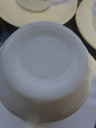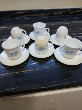 Set de 5 tazas (una se rompió) y 5 platos de la marca Arcopal, aptos para lavavajillas y microondas, capacidad de 16 cl por taza. Tengo muchas cosas en mi perfil. Entrego Ríos Rosas o Canal
