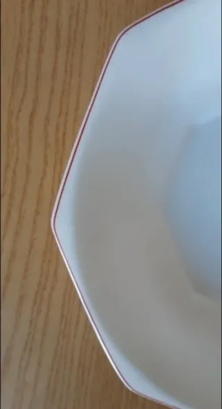 Fuente de cerámica de Arcopal con un diseño octogonal. - Color blanco. - Borde fino en rojo - Material resistente. - Mide 30 cm. - Se puede utilizar en microondas. - Se encuentra en excelentes condiciones.