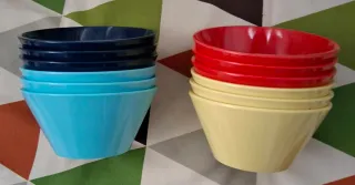 Lote de 12 cuencos de plástico de 4 colores de Ikea y 12 moldes de silicona para magdalenas de Habitat. Colores de los cuencos de plástico: Azul marino, azul cielo, rojo y amarillo. Están usados pero en buen estado. Miden 10 x 6 x 5cms. Los moldes de magdalenas son de silicona, en colores cálidos. Nunca se han usado. Miden 7 x 4,5 x 3 cms. Hago envíos o entrego en metro Fontana.