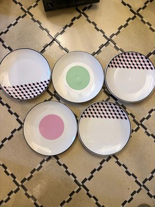 Conjunto de cinco platos planos de cerámica de Ikea. Presentan un diseño moderno con detalles geométricos y círculos de colores. - Diseño con patrón de cubos en rosa y negro. - Un plato con círculo central en verde menta. - Un plato con círculo central en rosa. - Borde negro.
