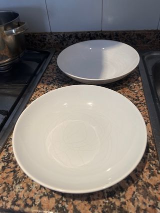 Conjunto de vajilla de porcelana blanca de Ikea. Incluye varios platos y cuencos. 6 platos hondos 25 cm sin usar. 5 llanos grandes 27,5 cm 6 llanos pequeños 22cm, uno tiene un pequeño defecto . - Diseño moderno y elegante. - Apto para lavavajillas y microondas.