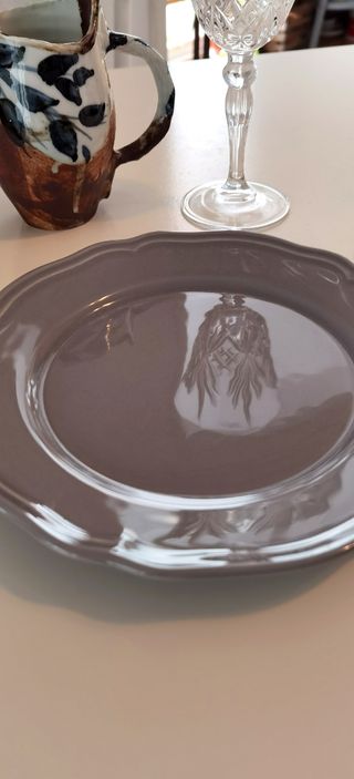 Conjunto de cinco platos hondos de color gris oscuro. Son ideales para servir sopas, pastas o guisos. - Diseño moderno y elegante. - Apto para lavavajillas. - 5 platos hondos - 5 platos grandes (uno de ellos con una mella) - 6 platos pequeños